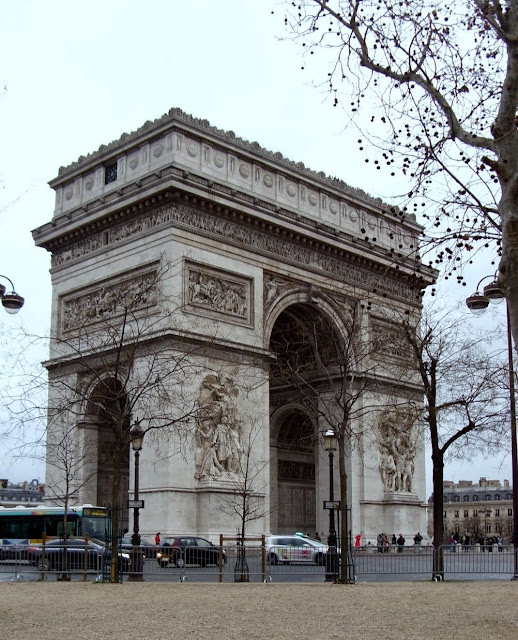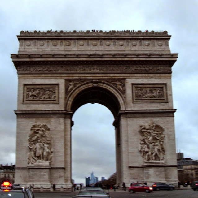 I dotarliśmy do Łuku Triumfalnego - Budowla powstała na chwałę Napoleona, w stylu neo-klasycystycznym. Prace rozpoczęto w roku 1806, a zakończono w 1836. Łuk stoi pośrodku ronda imienia Charlesa do Gaulle’a . Rozchodzi się od niego promieniście 12 ulic. Zdobią go rzeźby Rude’a, Corota i Étexa. Jedną z nich jest „Marsylianka” Rude’a upamiętniająca wymarsz ochotników na wojnę w 1792 r. Są na nim wypisane nazwy 128 bitew Republiki i Cesarstwa oraz nazwiska 660 generałów i marszałków, wśród których można znaleźć Poniatowskiego, Chłopickiego, Kniaziewicza, Sułkowskiego, Dąbrowskiego, Zajączka i Łazowskiego. Pod Łukiem znajduje się od 1920 r. Grób Nieznanego Żołnierza.
