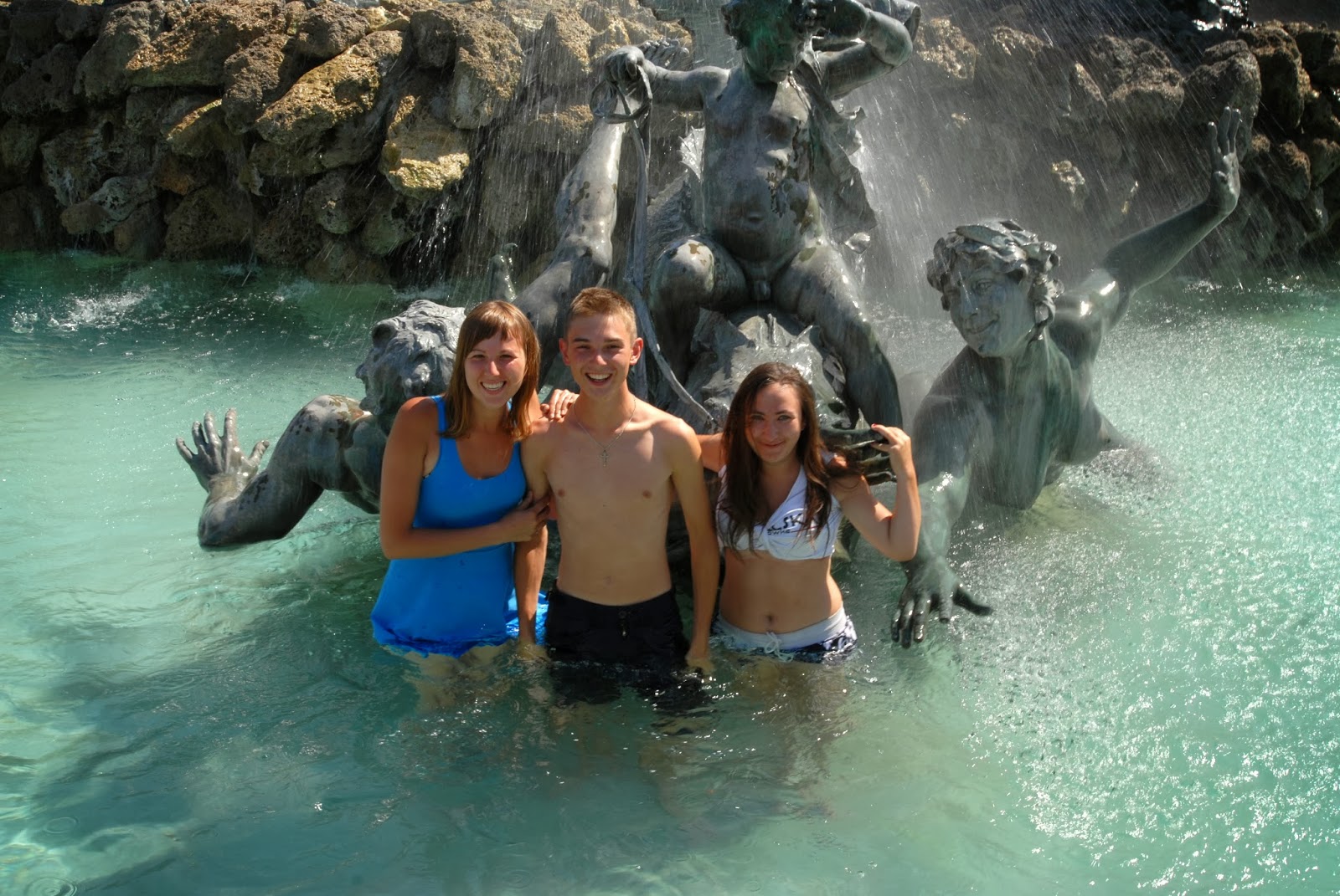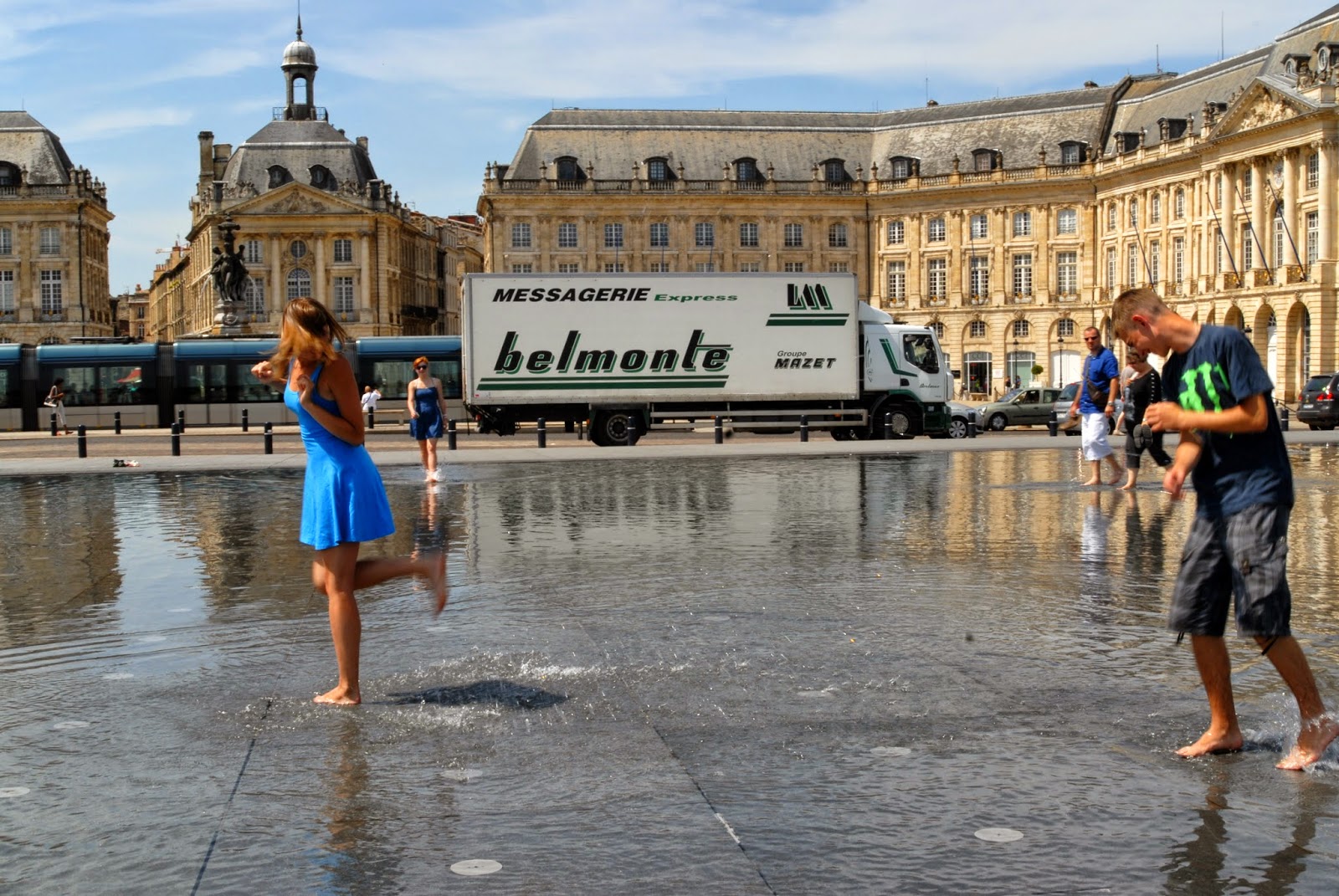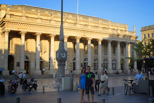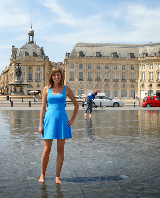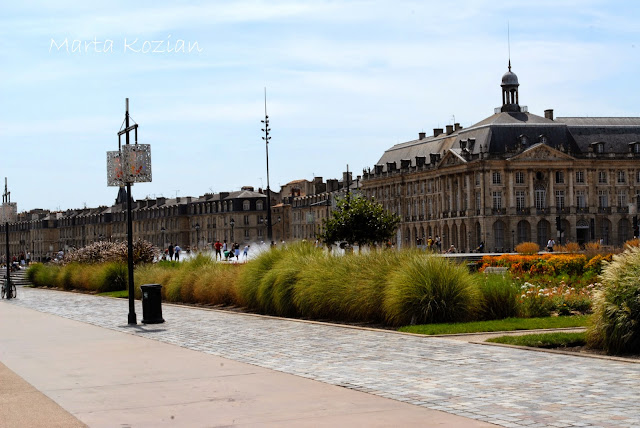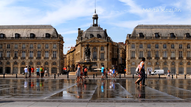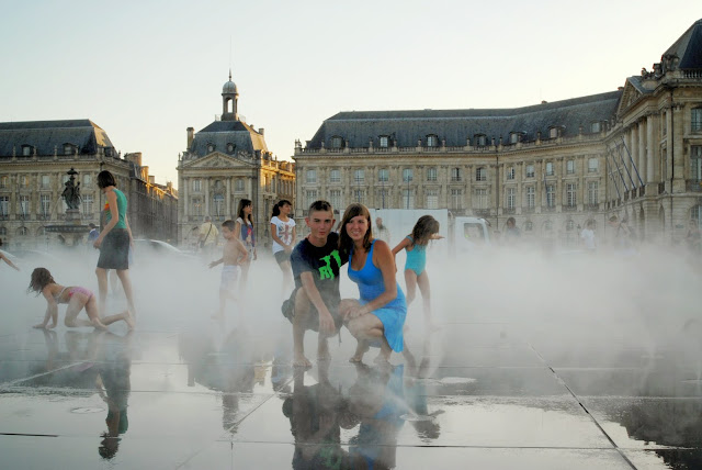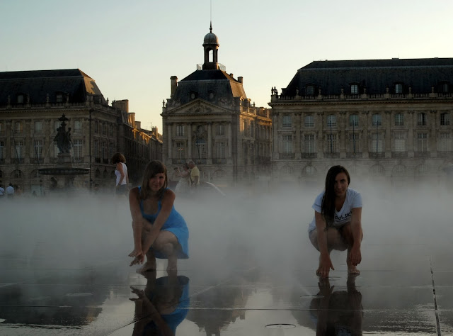 Dotarliśmy na Place de la Bourse, czyli Plac Giełdy. Jest to obecnie turystyczne centrum handlowe, gdzie można nabyć pamiątki dla bliskich, my jednak nie byliśmy tym zainteresowani, ponieważ jest to chyba najbardziej spektakularny plac w Europie, siedzieliśmy tam i po prostu podziwialiśmy. Obowiązkową atrakcją jest również tzw. Zwierciadło Wody, które co jakiś czas zamienia się w gęstą mgłę z pary, a gdy znowu wypełniało się wodą odbijało otaczające je budynki w tafli, niczym w lustrze. Spędziliśmy tam mnóstwo czasu, zabawa w fontannie, zwłaszcza w tak upalny dzień, była cudowna! Bordeaux znajduje się niedaleko Oceanu, czuć to w powietrzu :)