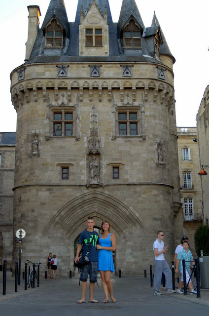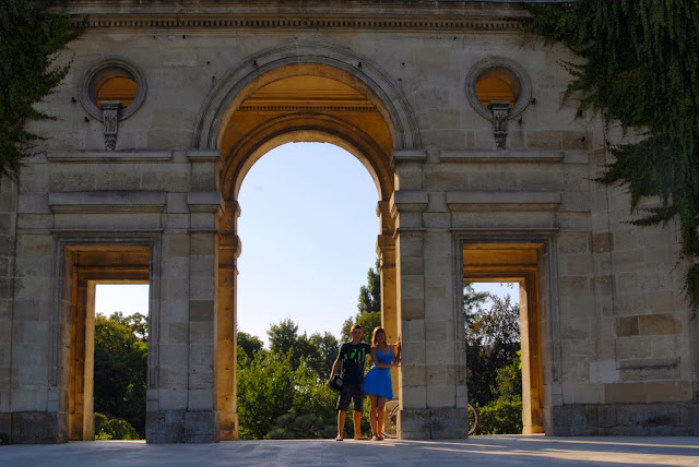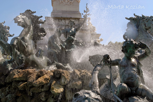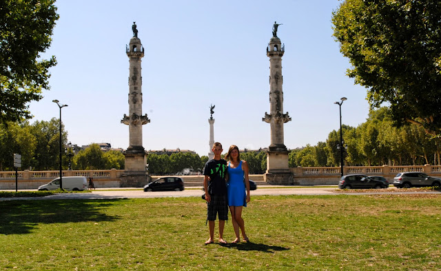 Kolejnym naszym przystankiem był park nad rzeką Garonną, rozłożyliśmy tam koc i karmiliśmy gołębie resztką naszego śniadania. Następnie spacerem po starówce dotarliśmy na Plac Quinconces, który zbudowany jest według planu tzw. kwinkunksu czyli usytuowania obiektów na czterech rogach i jednego centralnie w środku placu. Przypomina to nieco układ kropek w "piątce" na kostce do gry. Centralnym punktem placu jest fontanna z pomnikiem Monument des Girondins. Statua pomnika ma aż 50 m wysokości.