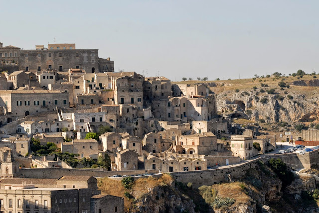 "Te odwrócone stożki, te lejki nazywają się Sassi, Sasso Caveoso i Sasso Barisano. Właśnie tak w szkole wyobrażałem sobie piekło Dantego... Wąziutka uliczka biegła na dachach domów, jeśli można je nazwać domami. To groty wyżłobione w ścianie wąwozu, ścianie ze stwardniałej gliny... Ulice są jednocześnie podłogami dla wychodzących z domostw powyżej i dachami dla tych poniżej... Drzwi były otwarte ze względu na upał. Przyglądałem się przechodząc obok i widziałem wnętrze grot, w których nie ma innego źródła światła i powietrza, niż drzwi. Niektóre nie mają nawet tego – wchodzi się z góry, przez właz i drabinę."