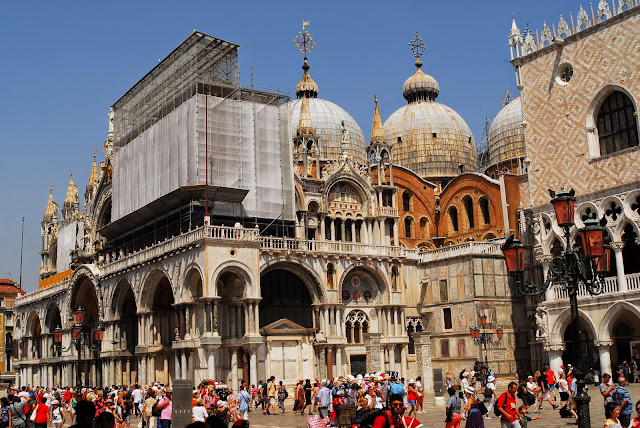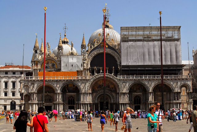 I w końcu dotarliśmy do najbardziej znanego miejsca w Wenecji - na plac św. Marka, na którym znajduje się najcenniejszy i najwspanialszy zabytek sakralny Wenecji, obiekt zachwytu znawców sztuki i rzesz turystów z całego świata. Sławny dzięki swej oryginalności, historii, pięknu i bogactwu artystycznemu. Bazylika św. Marka, zbudowana została 1000 lat temu. Sanktuarium bogate jest w dzieła sztuki wschodniej, które gromadzone były tu przez wieki. Architektura świątyni i wnętrza, sprawia, że kościół Św. Marka jest dziełem jedynym w swoim rodzaju w Europie łacińskiej i jednocześnie tak doskonałą w formie enklawą architektury bizantyńskiej we Włoszech.