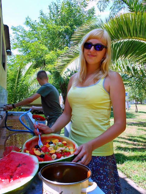 Po powrocie na kemping, stwierdziliśmy, że to najlepszy moment na zrobienie sałatki owocowej! Tym bardziej, że przy wejściu na kemping stał straganik, na którym sprzedawane były owoce z pola. Kupiliśmy gigantycznego arbuza, banany, nektarynki, melona i winogrona. Zapłaciliśmy za to grosze, co bardzo nas ucieszyło. Mając wszystkie składniki, zabraliśmy się do roboty!