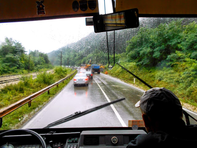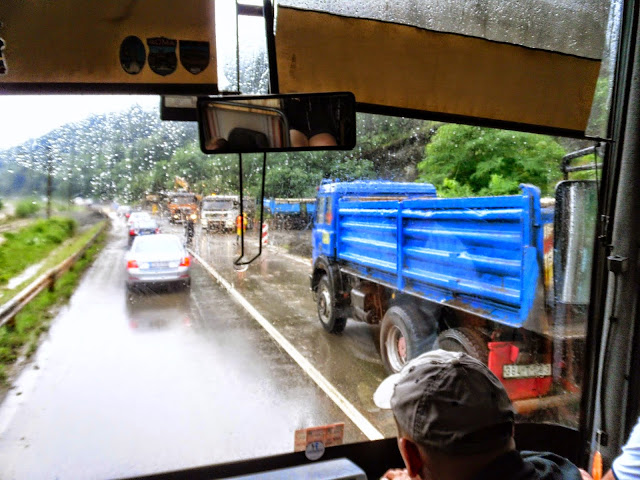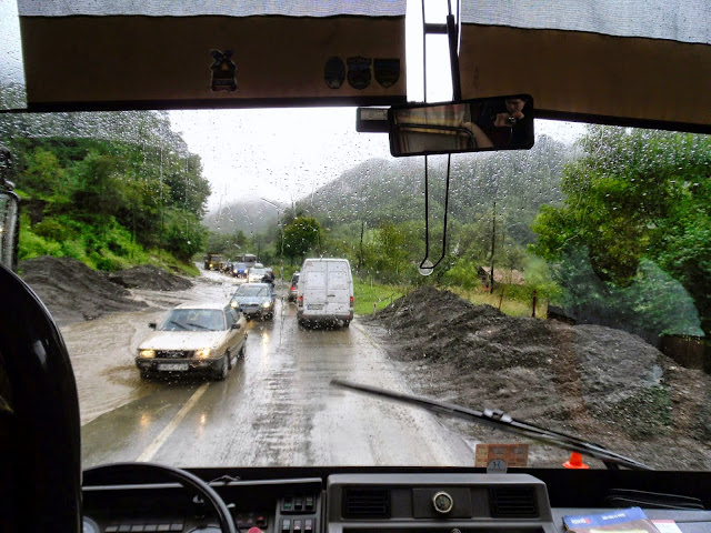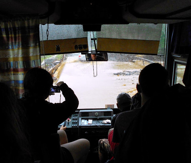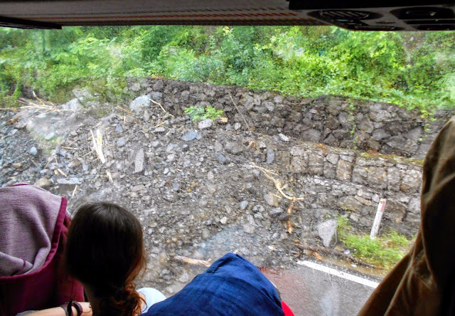 Po jakimś czasie dowiedzieliśmy się, co jest przyczyną naszego dwugodzinnego opóźnienia. Na główną drogę dojazdową do stolicy, przez ciągłe ulewy osunęła się ziemia z gór, a dalej dosłownie zrobiła się rzeczka i mały wodospad! Wszyscy robiliśmy zdjęcia i obserwowaliśmy to, co działo się za oknami. Bolek wypuścił nas na chwilę z autokaru, wszyscy biegliśmy za potrzebą pod mostek, a autokar stał w korku ;)