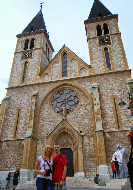 Dotarliśmy również do miejsca, które nas zachwyciło, była to Katedra Serca Jezusowego - rzymskokatolicka katedra, usytuowana przy Trgu fra Grge Matića. Wybudowana została w latach 1884-1889 i była pierwszą rzymskokatolicką katedrą w Sarajewie od czasu zburzenia kościoła katolickiego pod koniec XVII wieku. Neogotycka katedra posiada dwie wysokie dzwonnice, a pomiędzy nimi, nad wejściem znajduje się ogromna rozeta.