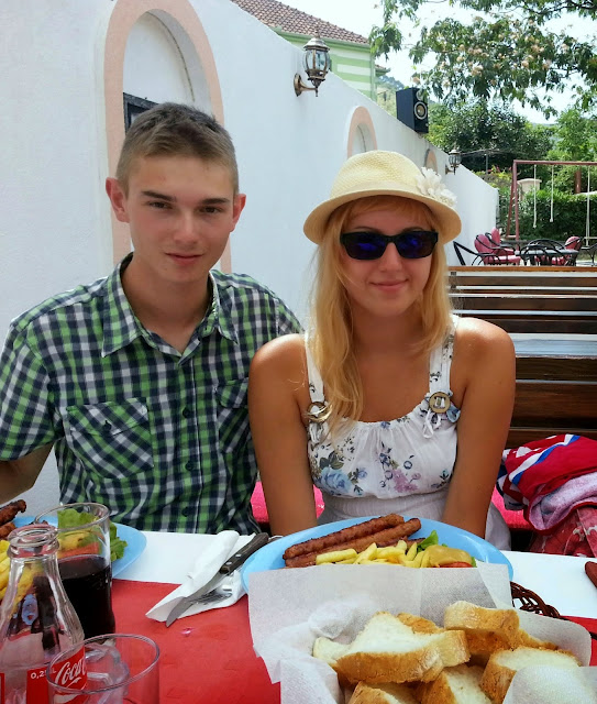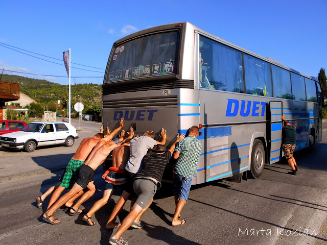 Po obiedzie poszliśmy szukać darmowego WiFi, żeby napisać do rodziców, po czym wróciliśmy do autokaru i o godzinie 16 wyjechaliśmy z Mostaru... Nie zajechaliśmy jednak daleko, bo jakieś kilkadziesiąt kilometrów, po czym nasz DUET nagle zgasł na środku skrzyżowania w małej mieścinie i już nie odpalił... Nie wiedzieliśmy co się stało, na początku wszyscy pomyśleliśmy, że to przez Bolka, który w tym momencie, gdy autokar zgasł, niechcący wyrwał kabel od mikrofonu, ale okazało się, że był to tylko zbieg okoliczności. Tak naprawdę zabrakło nam paliwa! DUET ma zepsuty wskaźnik paliwa i Pan Tadziu sam musi przeliczać kiedy trzeba zatankować, niestety we wczorajszym korku spaliliśmy ciut więcej, a dodając do tego górskie drogi... no cóż, to musiało się tak skończyć ;) Mieliśmy takiego farta, że zatrzymaliśmy się akurat obok stacji paliw! Paru bolkowiczów zajęło się tymczasowym kierowaniem ruchem drogowym, a reszta biegała z pustymi 5 litrowymi butlami po paliwo. Niestety nasz autokar dalej nie chciał odpalić, bo zapowietrzyła się pompa paliwowa... No to się nazywa mieć pecha ;)