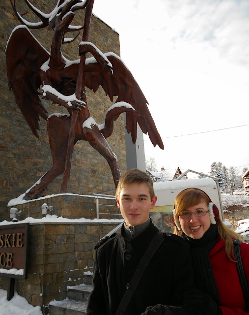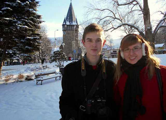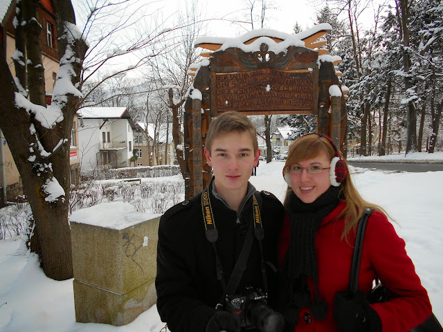 Do Karpacza dojechaliśmy na około godzinę 12 i tam zaczęły się nasze największe problemy... Gdy szukaliśmy parkingu, GPS poprowadził nas na wąską, zaśnieżoną, stromą drogę, obydwoje mieliśmy gigantycznego stresa, czy uda nam się podjechać pod tę górkę. Jakimś cudem udało nam się, lecz nogi mieliśmy dosłownie miękkie. Nie chcąc dalej kombinować i szukać miejsca w nieodśnieżonym Karpaczu postanowiliśmy, że zaparkujemy na Biedronkowym parkingu :) Przynajmniej był darmowy... Choć baliśmy się, że ktoś może się przyczepić, dlatego szybko ruszyliśmy na spacer po mieście.