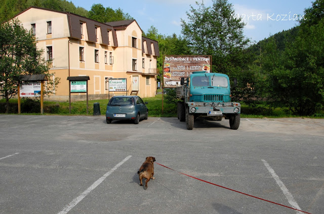 Standardowo na granicy wymieniliśmy trochę złotówek na korony. Dowiedzieliśmy się też, że jest remont drogi i lepiej jeśli pojedziemy inną tras, tak też zrobiliśmy, bo obydwie trasy nie były nam obce ;) jak miło było znów znaleźć się w tym miejscu! Wjechaliśmy na parking (50 koron) i pierwsze co zrobił nasz Mordek, to władowanie się do rzeki ;)