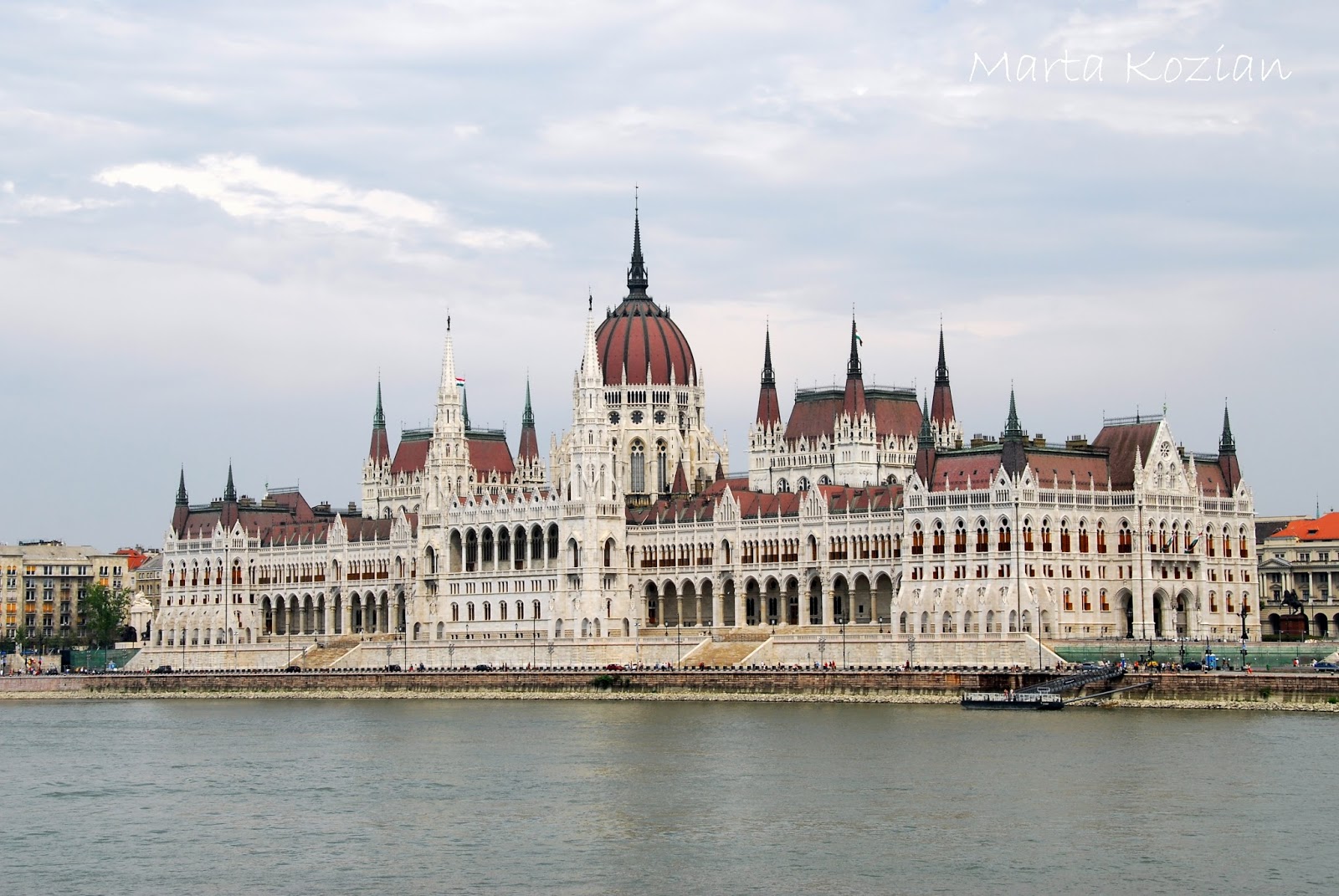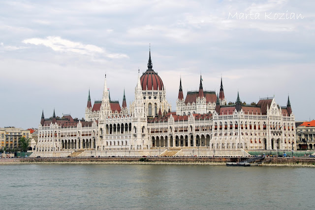 I oto jest nasz główny cel! Budynek parlamentu, zwany Orszaghaz jest najbardziej charakterystycznym budynkiem Budapesztu. Istnieje podobieństwo między parlamentami w Londynie i tym w Budapeszcie, z tym że budapesztański rozciąga się aż na 269 metrach wzdłuż Dunaju. Charakterystyczną cechą tej budowli są setki podpór, 88 postaci władców węgierskich oraz potężna prawie stumetrowa kopuła. Od kopuły rozchodzą się dwa symetryczne skrzydła. Budowa parlamentu trwała 17 lat i rozpoczęła się w 1885 roku. W ubiegłym roku nie zdążyliśmy dojść do niego, bo nie spodziewaliśmy się, że koło godziny 2 w nocy, oświetlenie budynków jest wyłączane.