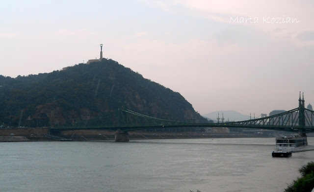 DUET był zaparkowany dość daleko od naszego głównego celu podróży, lecz zaraz po odejściu od autokaru, dostrzegliśmy znaną nam z poprzedniego wyjazdu górę Gellérta (Gellért Hegy) - swoją nazwę zawdzięcza ona biskupowi Gellertowi, który z nakazu pierwszego króla Węgier, Stefana, ochrzcił plemiona Madziarów. Po śmierci swego królewskiego protektora został schwytany przez byłych pogan i z zemsty zamknięty w drewnianej beczce, którą następnie spuszczono z urwiska. Dziś w legendarnym miejscu śmierci biskupa, tuż nad wodospadem, wznosi się jego pomnik. Uważana również za miejsce spotkań czarownic. W 1851 roku Habsurburgowie wznieśli tam Cytadele. Twierdzę o długości 220 i szerokości dochodzącej do 60m zaprojektował generał Emanuel Zitta. Na szczycie góry znajduje się również pomnik Wolności, wzniesiony w 1947r. według projektu Zsigmonda Kisfaludi Strobla. Olbrzymi posąg (40m wysokości) przedstawia kobietę trzymającą w wyciągniętych dłoniach gałązkę palmową, symbol zwycięstwa.