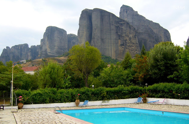 To była naprawdę ciężka noc jazdy... Na dodatek w końcu przekroczyliśmy granicę i znaleźliśmy się w naszej wymarzonej Grecji! Już nie mogliśmy się doczekać tego, co na nas tu czeka, co nas spotka... Zmieniała się również strefa czasowa (+1h), był to pierwszy raz gdy znaleźliśmy się właśnie w tej strefie, bo do tej pory będąc w Anglii, czy Portugalii jedynie odejmowaliśmy sobie godzinę ;) O godzinie 7:50 wjechaliśmy na kemping Vrachos, znajdujący się zaraz przy przepięknych, górskich Monastyrach. Kemping był całkiem fajny, schludne łazienki, basen, wspaniała lokalizacja... i gdyby nie to, że Bolek wykupił nam miejsca "pod daszkiem", żeby zaoszczędzić, to wszystko byłoby idealnie ;) Nie mogliśmy nigdzie rozłożyć namiotów, bo nie zostało nam przydzielone na nie miejsce... No cóż, przynajmniej były prysznice!