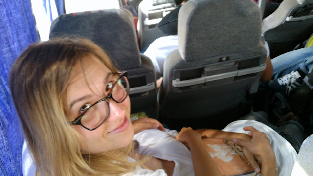 Droga do autostrady była kręta i dość długa, lecz gdy tylko wjechaliśmy na A4 czas jakby przyspieszył... Zrobiliśmy krótki postój na śniadanie w McDonaldzie, daliśmy znać rodzicom, że już jesteśmy niedaleko i ruszyliśmy dalej... W autokarze zaczynały się już porządki, każdy szukał swoich rzeczy. My na szczęście nie mieliśmy aż takiego bałaganu, więc gdy wszytko mieliśmy już gotowe, mogliśmy trochę pospać, a żeby było wygodniej, to spaliśmy na zmianę ;) Na poniższym zdjęciu widać jak Michał rozłożył się na mnie wygodnie i drzemał, a ja miałam czas by powspominać ten wyjazd, który powoli przechodził do historii... Jesteśmy szczęściarzami, że mogliśmy tworzyć tę historię :)