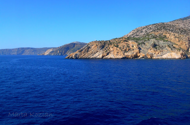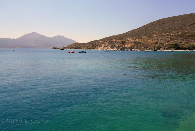 Obudziliśmy się koło godziny 7 rano, a intensywny zapach tej dziwnej rośliny od razu nas orzeźwił... Zjedliśmy śniadanie, przepakowaliśmy torby, bo na górze autokaru mieliśmy już zdecydowanie za dużo rzeczy i to niekoniecznie tych czystych ;) i o godzinie 10 byliśmy już w Adamas. Od razu poszliśmy do sklepu, tym razem nie zamierzaliśmy wydać ani centa na drogie jedzenie na promie. Kupiliśmy wodę, sok, pepsi i ciasteczka, a w piekarni dość spore pizzerki, tym razem 9-godzinna podróż nie była nam straszna ;) Wracając ostatni raz wstąpiliśmy na przepyszne lody do znanej nam już lodziarni. Pod autokarem czekało nas kolejne przepakowanie, bo przez 9 godzin mieliśmy być odcięci od naszego DUETu. Spakowaliśmy więc do torby wszystkie potrzebne nam rzeczy, w tym jedzenie, picie i ładowarki do telefonów i aparatów. Następnie udaliśmy się do darmowej toalety w porcie, gdzie zrobiliśmy sobie pseudo prysznic ;) Trochę szkoda było nam żegnać malutką Milos, choć wiedzieliśmy, że jeśli zostalibyśmy tu choćby jeden dzień dłużej, to moglibyśmy zginąć z nudów ;)