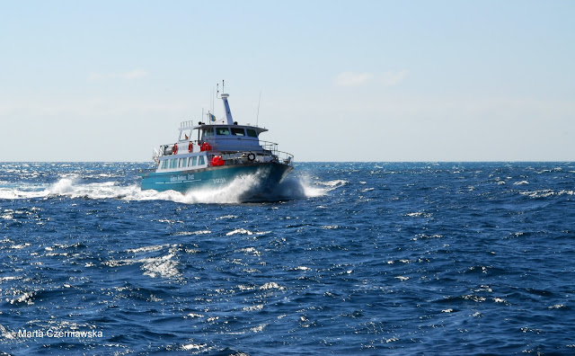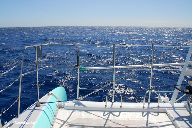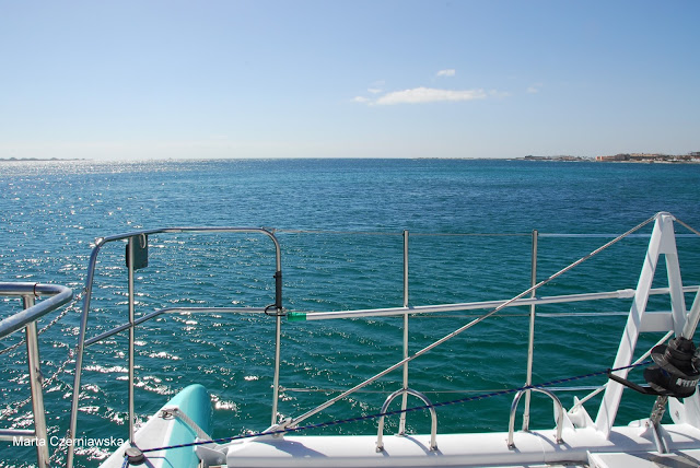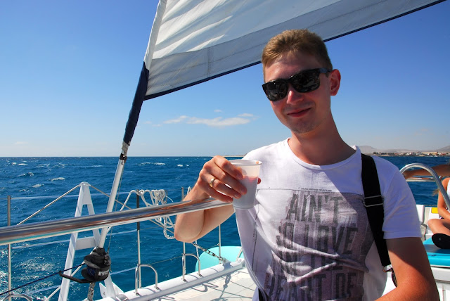 Nie mogliśmy doczekać się wejścia na pokład i ustawiliśmy się jako jedni z pierwszych żeby zająć dobre miejsca na dziobie katamaranu. Okazało się, że byliśmy jedynymi polakami na statku. Większą część stanowili Francuzi i Anglicy. Kapitan wraz z załogą okazali się młodymi, morskimi wilczkami, ale pomimo młodego wieku widać było, że są zahartowani, przygotowani i uwielbiają to co robią. Wręcz palili się do wypłynięcia z portu. W międzyczasie usłyszeliśmy wykład w 3 językach na temat zasad panujących na statku. Na koniec usłyszeliśmy zdanie "Don't panic, it's not Titanic" na co oczywiście odpowiedziała fala śmiechu, po czym rozwinęliśmy żagiel i poczuliśmy prawdziwą, dziką siłę wiatru. To było naprawdę niesamowite!