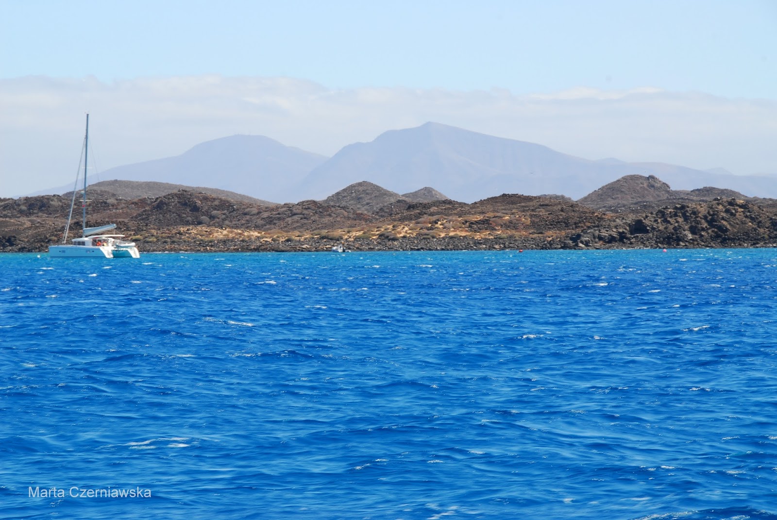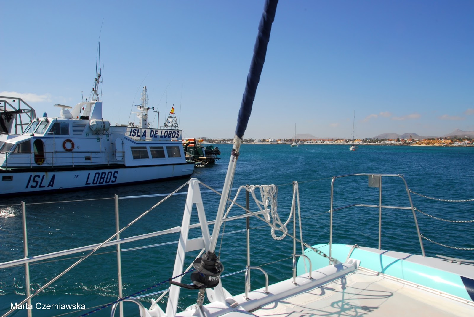 Ten dzień naszej podroży poślubnej zapowiadał się naprawdę ciekawie. W planach mieliśmy rejs katamaranem na maleńką wysepkę Lobos. Poszliśmy więc szybko na śniadanie, a następnie udaliśmy się w stronę hotelu, spod którego odjeżdżał autokar w stronę portu Corralejo. Tego dnia chyba nic nie mogłoby popsuć nam humorów, bo uwielbiamy pływać, ogólnie uwielbiamy wodę i wszystko co z nią związane ;)
