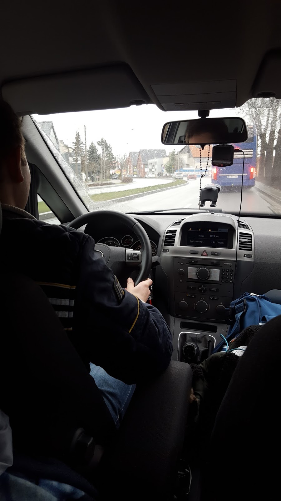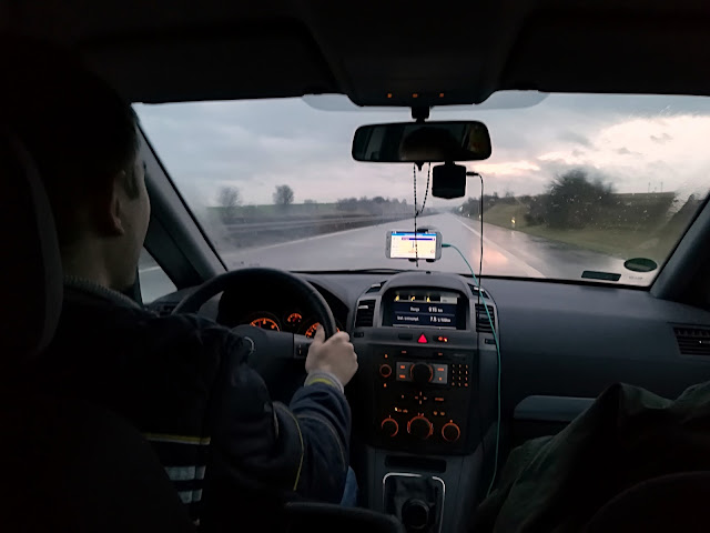 Jako porę podróży wybraliśmy naturalne godziny snu naszego szkraba, co ze względów logistycznych i strategicznych było świetnym wyborem. Nie ma to jak jechać w spokoju, słuchając cicho radia, gdy pociecha śpi smacznie i nie marudzi. Ciągniesz się wtedy koło za kołem, od czasu do czasu wrzucając lewy kierunkowskaz, by wyprzedzić jakąś ciężarówkę lub innego leniwie sunącego użytkownika drogi. Jest ciemno, spokojnie, obserwujesz czerwone punkty przed sobą, czyli światła innych aut, łapie cię pozorne poczucie bezpieczeństwa, nastawiasz temperaturę w aucie na 20℃ i pomału zasypi... O cholera!!! I o wypadek nietrudno, zwłaszcza dla osób takich jak ja, czyli nocnych śpiochów, których ciężko obudzić nawet pracą młota udarowego. I o ile jadąc do Anglii czułem przez pewien czas adrenalinę związaną z wyjazdem i całą tą otoczką, o tyle to uczucie znika po jakiś 300 km. W tym czasie przyzwyczajasz się już do jazdy na tyle, że adrenalina przestaje być produkowana i zostaje już tylko kofeina zawarta w twojej zimnej kawie. Dlaczego zimnej? Bo okazuje się, że do promu masz mnóstwo czasu, bo prawie 13 godzin. Potem robisz pięciominutową przerwę na stacji, by zakupić ten oto napój bogów i okazuje się że GPS, który pokazywał że dojedziesz na miejsce za 12 godzin pokazuje nagle 13 godzin, a za 13,5 godziny zamykana jest odprawa na prom! Myślisz sobie, pff, nadrobię. Tylko okazuje się, że jedziesz już godzinę, a czas przyjazdu skrócił się o zaledwie 5 minut. Tak więc robisz co możesz, żeby nie zatrzymywać się już więcej, nie kupować kolejnej kawy, więc pozostaje dopić tą zimną, która jedzie dzielnie w uchwycie na kawę. Jakie to niesprawiedliwe. Ty tylko chciałeś napić się kawy, to było tylko 5 minut! W tym miejscu nauczyłem się pierwszej ważnej rzeczy o jeździe na tak długie dystanse.