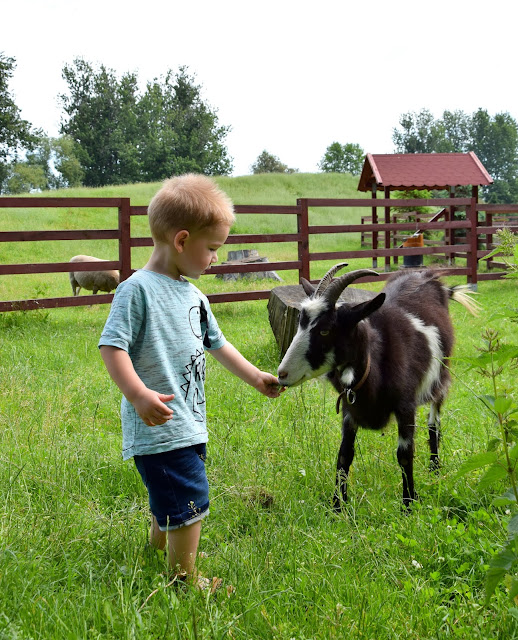 Jednak jedną z największych atrakcji dla naszego małego podróżnika były kozy! Można je pogłaskać, można dać im kawałek zerwanej trawki... No raj dla fana wszelkiego rodzaju zwierzątek 😁