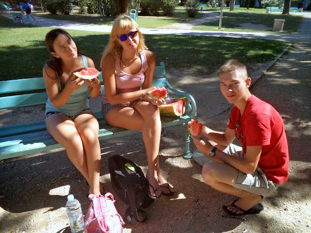 Po drodze weszliśmy do Konzuma, żeby kupić wodę do picia. Skusiliśmy się też na niezwykle tanią połówkę arbuza... Później tego pożałowaliśmy, bo gdy skosztowaliśmy go w parku, okazało się, że na pewno był on czyszczony jakimiś chemikaliami... Pewnie był już nieświeży, a bardzo chcieli go sprzedać... Arbuz niestety wylądował w kuble. Na dodatek Michał, podczas krojenia arbuza, dość mocno rozciął sobie palca nożem...