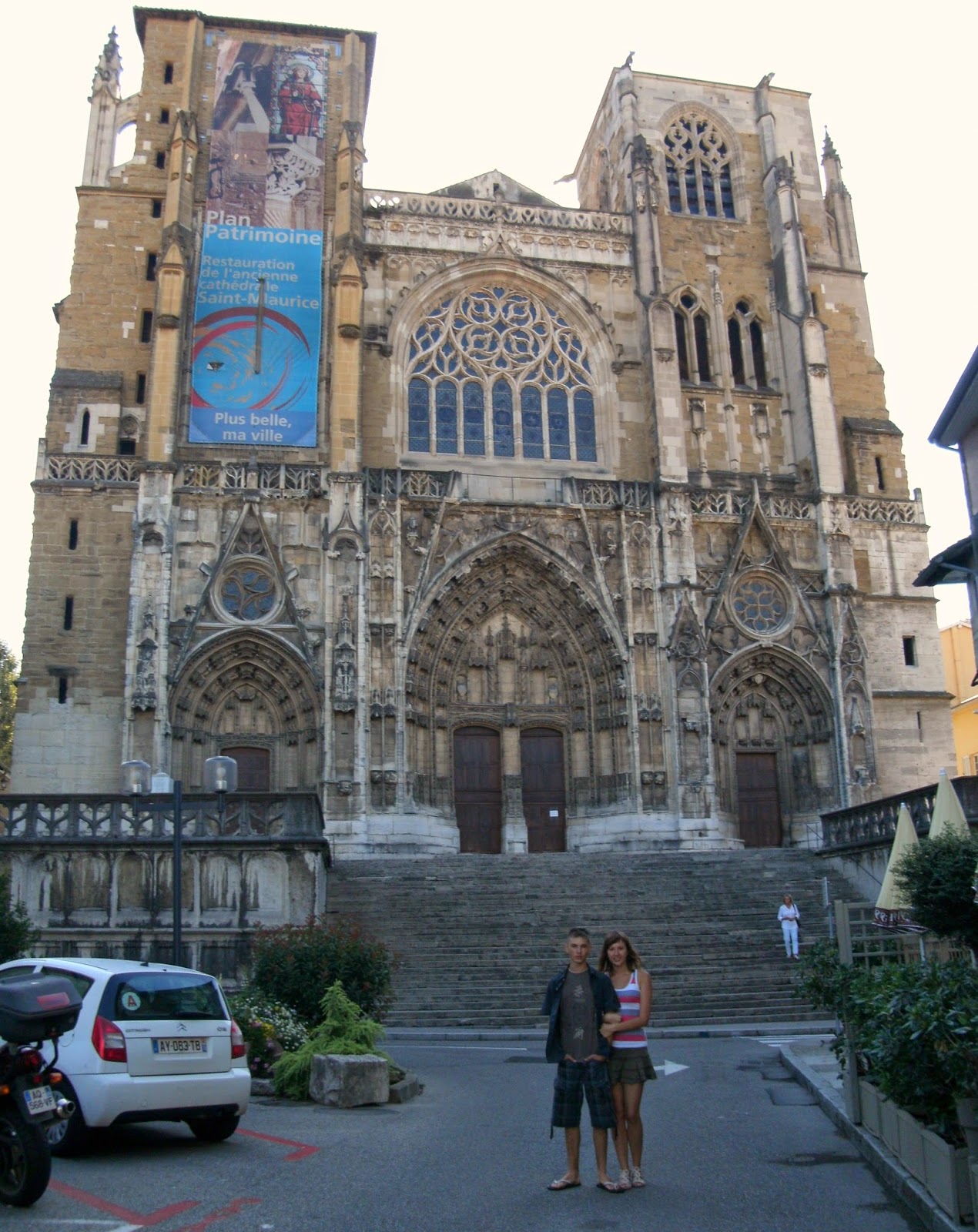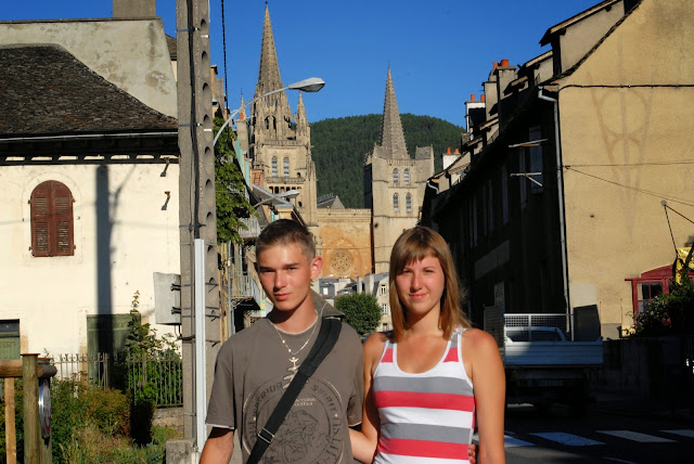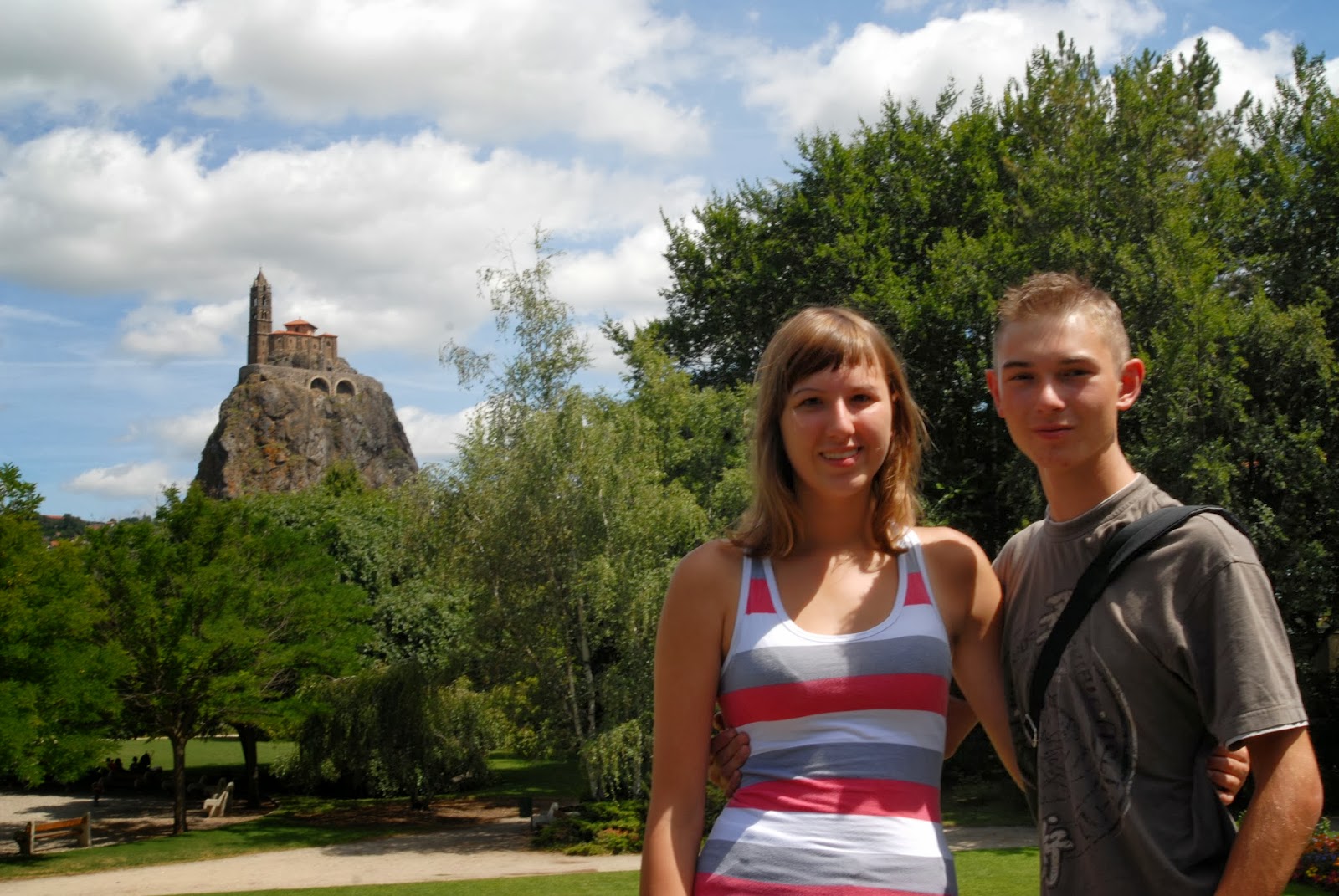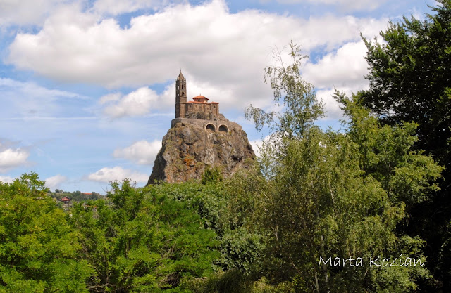 O godzinie 10 ruszyliśmy w drogę i po trzech godzinach jazdy dotarliśmy do miasteczka Le Puy-en-Velay. Bardzo ciekawe miasto położone na terenie wygasłych wulkanów, otoczone jest wzniesieniami i czarnymi skałami. Najciekawszą atrakcją jest usytuowana na wzgórzu katedra Saint Michel d`Aiguilhe. Świątynia wybudowana została na szczycie wznoszącej się na wysokość 85 m stromej skały i w jakimś sensie stanowi jej zwieńczenie. Niewielkie rozmiary kościoła zostały wymuszone brakiem wystarczającej płaskiej powierzchni. Wygląda to wspaniale, jednak nie wyobrażam sobie wspinaczki na szczyt.