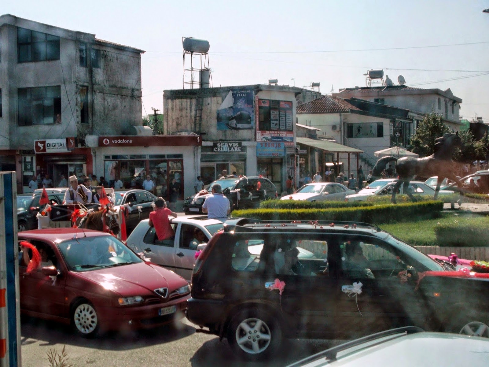 Pierwszym na co zwróciliśmy uwagę, po wjeździe do Albańskiej stolicy, były gigantyczne korki i hałas. Wszyscy trąbili, krzyczeli... Po chwili zorientowaliśmy się, że w niektórych autach, lub na bryczkach, siedzą pary młode! Wszyscy byli wystrojeni i prezentowali się świetnie. Jeszcze nigdzie nie widzieliśmy tak hucznego świętowania, jak właśnie w Albanii ;) A ślubów tego dnia widzieliśmy (i słyszeliśmy) mnóstwo! Doliczyliśmy ponad 18! Cale szczęście, że młoda policjantka zatrzymała ruch i pomogła nam przejechać autokarem przez zakorkowane skrzyżowanie :)