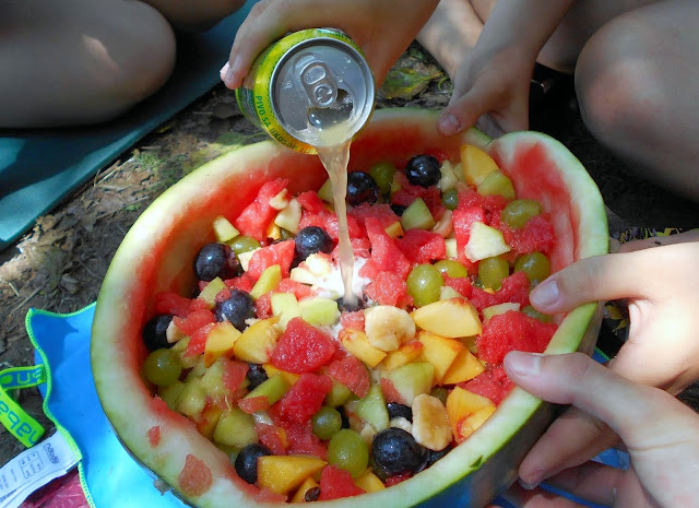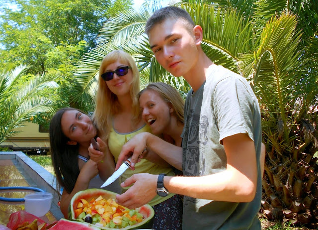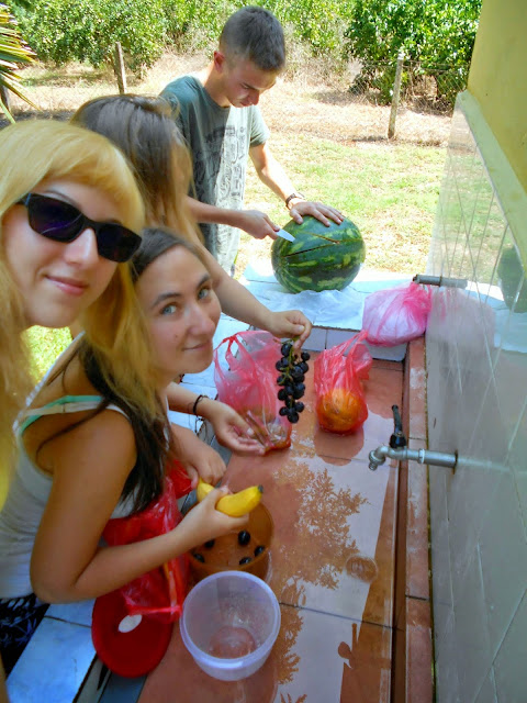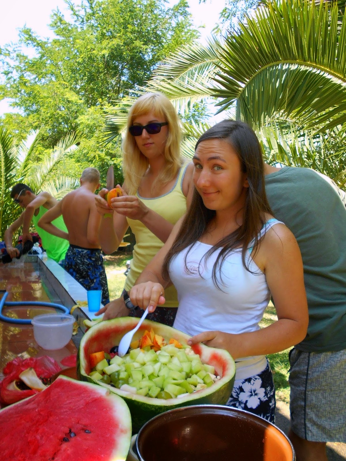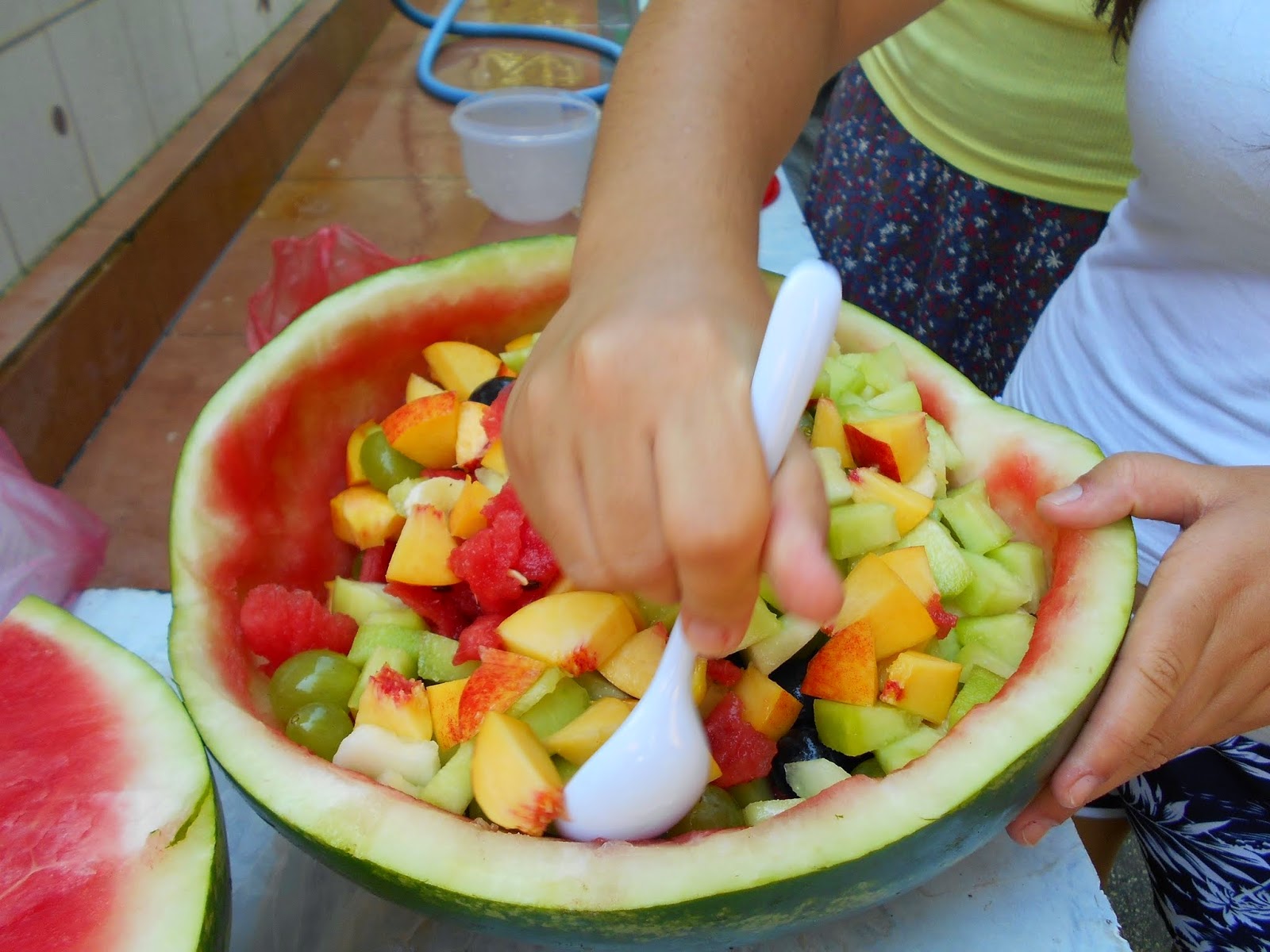 Po powrocie na kemping, stwierdziliśmy, że to najlepszy moment na zrobienie sałatki owocowej! Tym bardziej, że przy wejściu na kemping stał straganik, na którym sprzedawane były owoce z pola. Kupiliśmy gigantycznego arbuza, banany, nektarynki, melona i winogrona. Zapłaciliśmy za to grosze, co bardzo nas ucieszyło. Mając wszystkie składniki, zabraliśmy się do roboty!