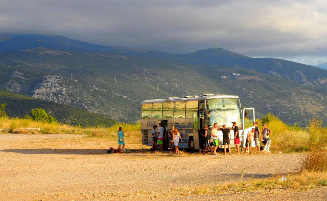 O godzinie 20:30 byliśmy już pod autokarem. Gdy spokojnie jedliśmy bułki z serem, parówką i sosem, podjechało do nas auto... Byliśmy większą grupą, każdy szykował sobie kolację. Z auta wysiadł mężczyzna, oczywiście nie mówił po angielsku... Pokazał nam swoją odznakę policyjną i powiedział "No camping", wspomniał również, że możemy zjeść, ale nie możemy tu spać. Autokar może zostać na całą noc. Zapewniliśmy go, że nie będziemy tu nocować, więc odjechał. Musimy przyznać, że trochę pokrzyżował nam plany...