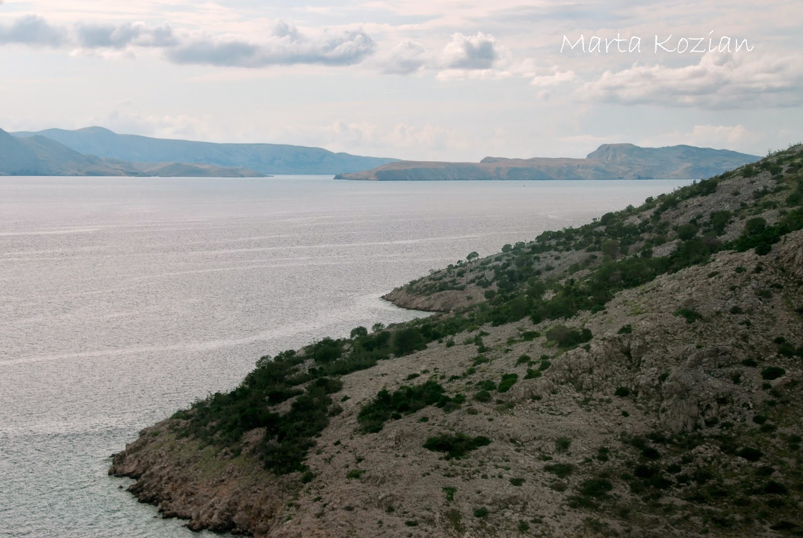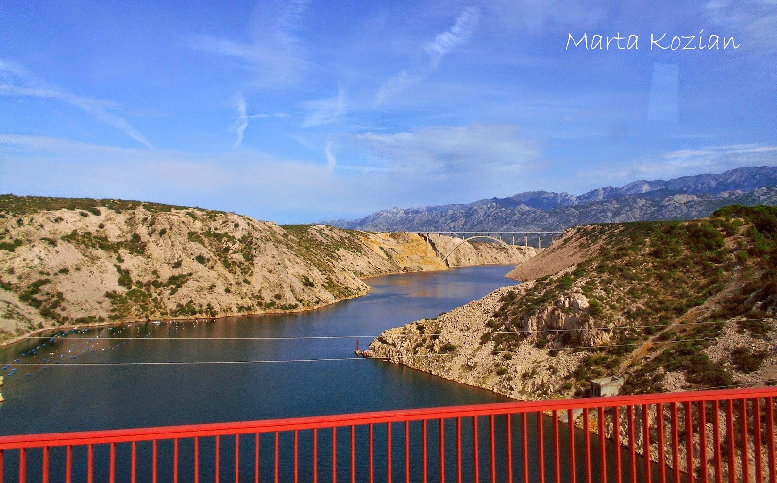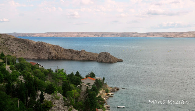 O godzinie 9 odjechaliśmy z Zadaru, Bolek obiecał, że pół dnia spędzimy dzisiaj na plaży. Ucieszyło nas to, bo potrzebowaliśmy odrobiny relaksu... Widoki były niesamowite! Na poniższym zdjęciu widoczny jest żelbetonowy, drogowy most łukowy, łączący stały ląd z chorwacką wyspą Krk.
