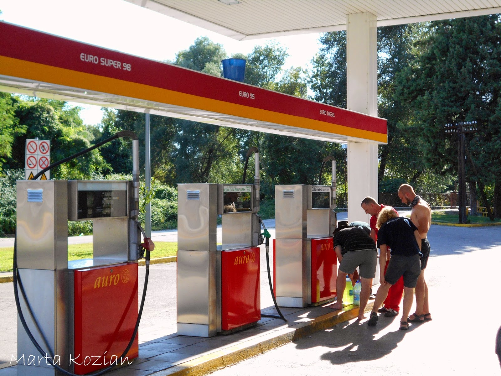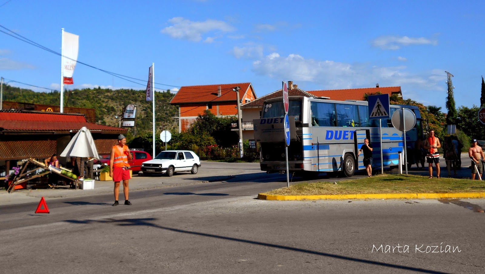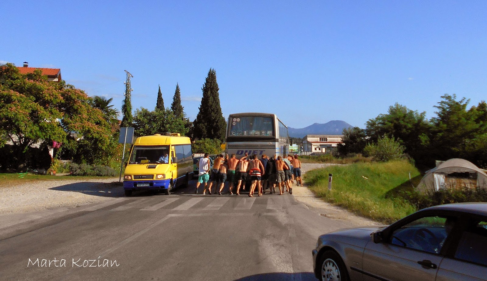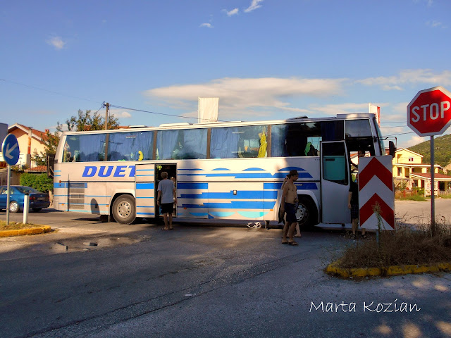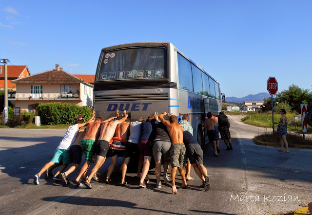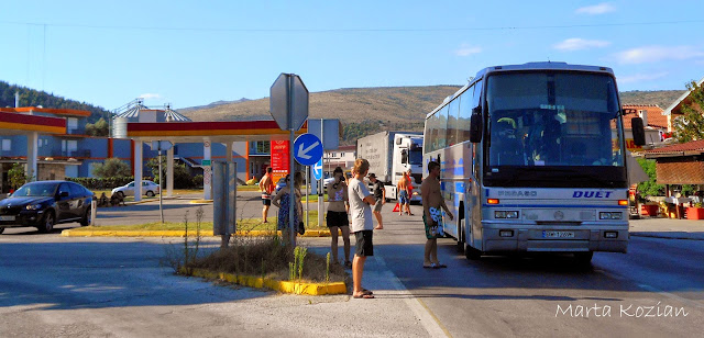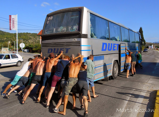 Po obiedzie poszliśmy szukać darmowego WiFi, żeby napisać do rodziców, po czym wróciliśmy do autokaru i o godzinie 16 wyjechaliśmy z Mostaru... Nie zajechaliśmy jednak daleko, bo jakieś kilkadziesiąt kilometrów, po czym nasz DUET nagle zgasł na środku skrzyżowania w małej mieścinie i już nie odpalił... Nie wiedzieliśmy co się stało, na początku wszyscy pomyśleliśmy, że to przez Bolka, który w tym momencie, gdy autokar zgasł, niechcący wyrwał kabel od mikrofonu, ale okazało się, że był to tylko zbieg okoliczności. Tak naprawdę zabrakło nam paliwa! DUET ma zepsuty wskaźnik paliwa i Pan Tadziu sam musi przeliczać kiedy trzeba zatankować, niestety we wczorajszym korku spaliliśmy ciut więcej, a dodając do tego górskie drogi... no cóż, to musiało się tak skończyć ;) Mieliśmy takiego farta, że zatrzymaliśmy się akurat obok stacji paliw! Paru bolkowiczów zajęło się tymczasowym kierowaniem ruchem drogowym, a reszta biegała z pustymi 5 litrowymi butlami po paliwo. Niestety nasz autokar dalej nie chciał odpalić, bo zapowietrzyła się pompa paliwowa... No to się nazywa mieć pecha ;)