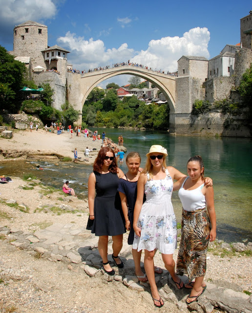 O godzinie 10 ruszyliśmy w drogę do Mostaru. Przez szyby podziwialiśmy niezwykle malownicze krajobrazy... Bałkany są wspaniałe! Po godzinnej jeździe byliśmy na miejscu. Udało nam się znaleźć parking 100 metrów od centrum starego miasta, był on oczywiście płatny i mogliśmy na nim zostać tylko do godziny 15. Było nam to na rękę, Mostar nie jest dużym miastem, więc nie potrzeba zbyt wiele czasu na zwiedzenie go. Pan z parkingu dał nam mapki miasta i pokazał fajne miejsce na obiad :)