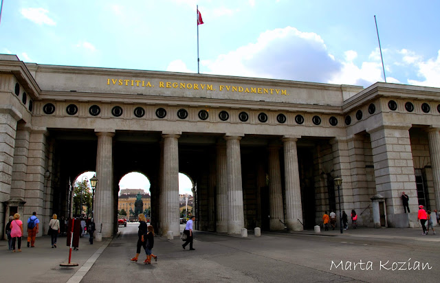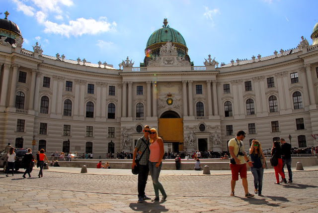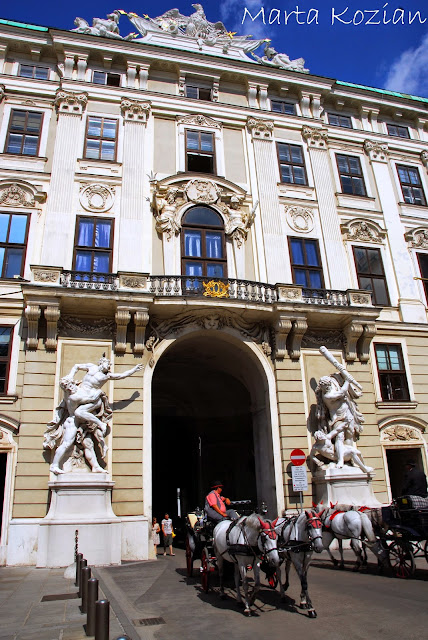 Dotarliśmy pod Pałac Hofburga - budynek pochodzi z XIII wieku, od tego czasu aż do 1918 roku rezydowali tam kolejni władcy austriaccy. Budynek był wielokrotnie rozbudowywany i udoskonalany. Mimo to jest miejscem gdzie na wieki przetrwał ogrom dziedzictwa narodowego Austrii. Pałac składa się z kilku części, najstarszą z nich jest Dziedziniec Szwajcarski, tam dawniej rezydowała broniaca palacu gwardia szwajcarska. Aktualnie w Pałacu, w skrzydle Leopolda znajduje się rezydencja prezydenta Austrii, natomiast w apartamentach Franciszka Jozefa mieści się muzeum. W muzeum tym znajdują się skarby kultury sakralnej oraz świeckiej.