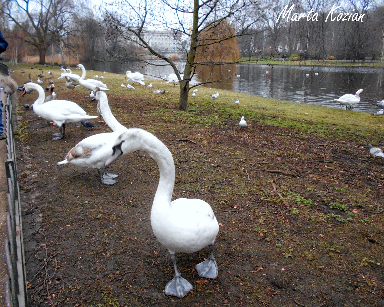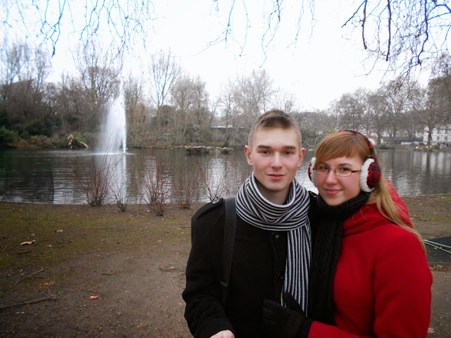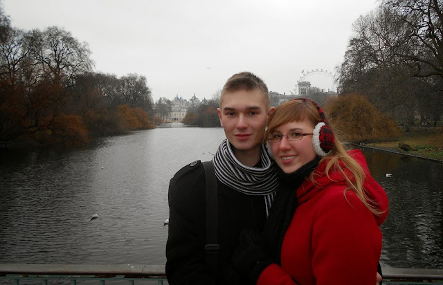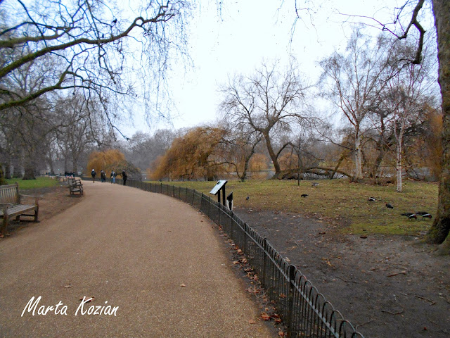 Następnie przeszliśmy przez jeden z naszych ulubionych parków w Londynie, St. James's Park (park św. Jakuba) - jest najstarszym z parków wchodzącym w skład królewskich parków w Londynie. Park ma powierzchnię 23 hektarów (58 akrów). Granice St. James's Park są wyznaczane przez ulice The Mall na północy, Hourse Guards na wschodzie i Birdcage Walk na południu. W parku znajduje się małe jezioro o nazwie St. James's Park Lake, z dwiema wyspami, Duck Island (nazwana tak ze względu na występowanie w parku wielu gatunków ptactwa wodnego) oraz West Island. Most biegnący nad jeziorem pozwala zobaczyć wschodnią stronę Pałacu Buckingham otoczoną drzewami i fontannami oraz podobnie otoczoną zachodnią fasadę siedziby Foreign Office.