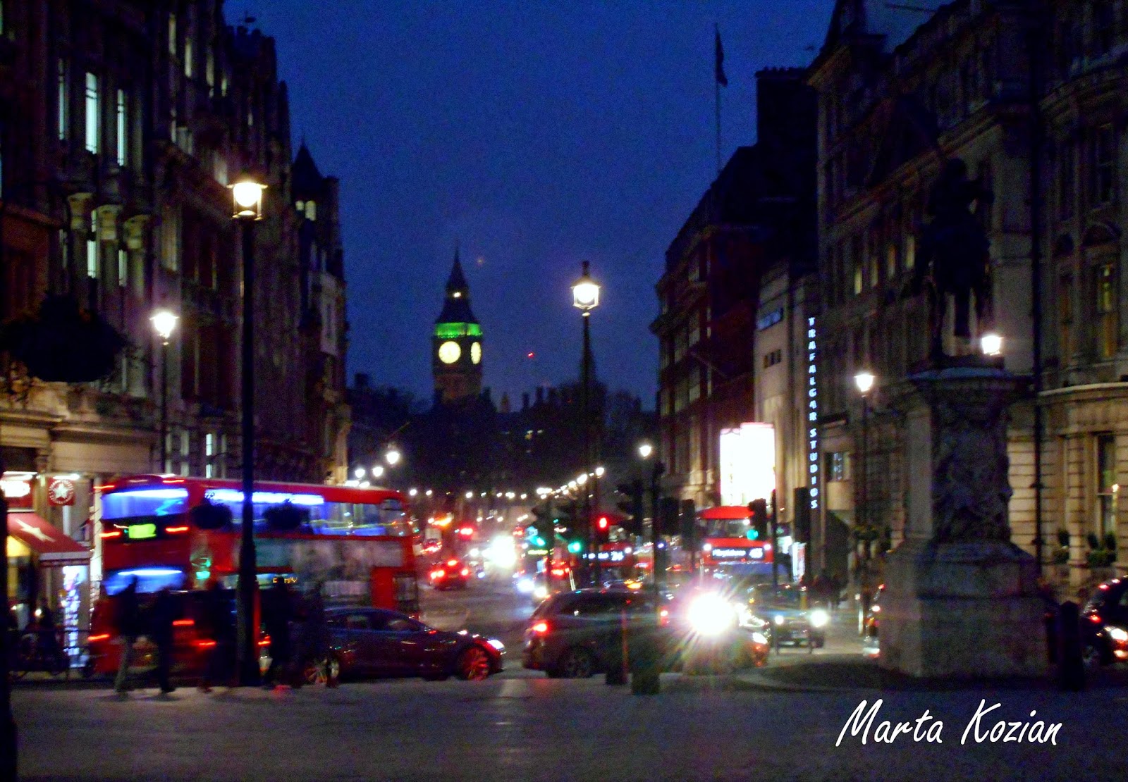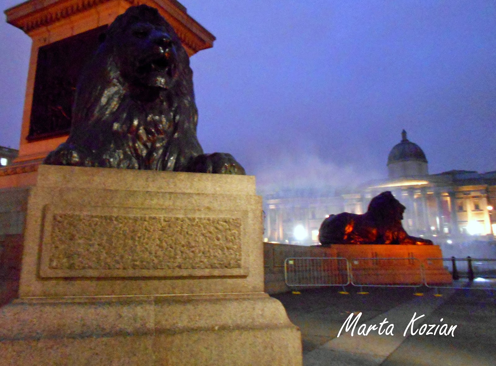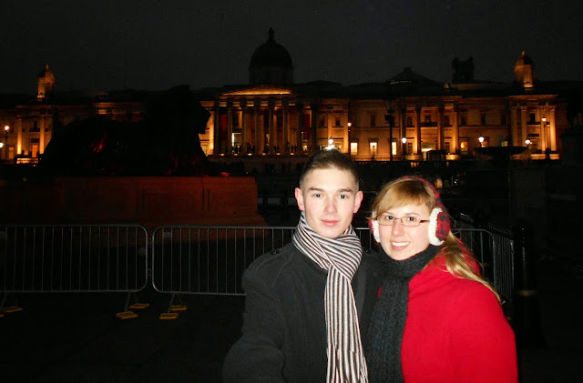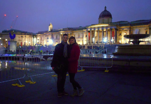 Zaczynało robić się naprawdę zimno, dlatego dość szybkim krokiem poszliśmy w stronę Trafalgar Square - plac w centralnym Londynie położony w dawnym miejscu stajni królewskich. Jego budowę zaczęto w 1829 roku a w 1843 ustawiono na środku 55 metrową Kolumnę Nelsona. Plac zdobią także pomniki króla Jerzego IV, gen Haveloka i gen Napiera oraz fontanny sir Lutyensa. Jest to tradycyjne miejsce spotkań i zgromadzeń zarówno politycznych jak i sylwestrowych.