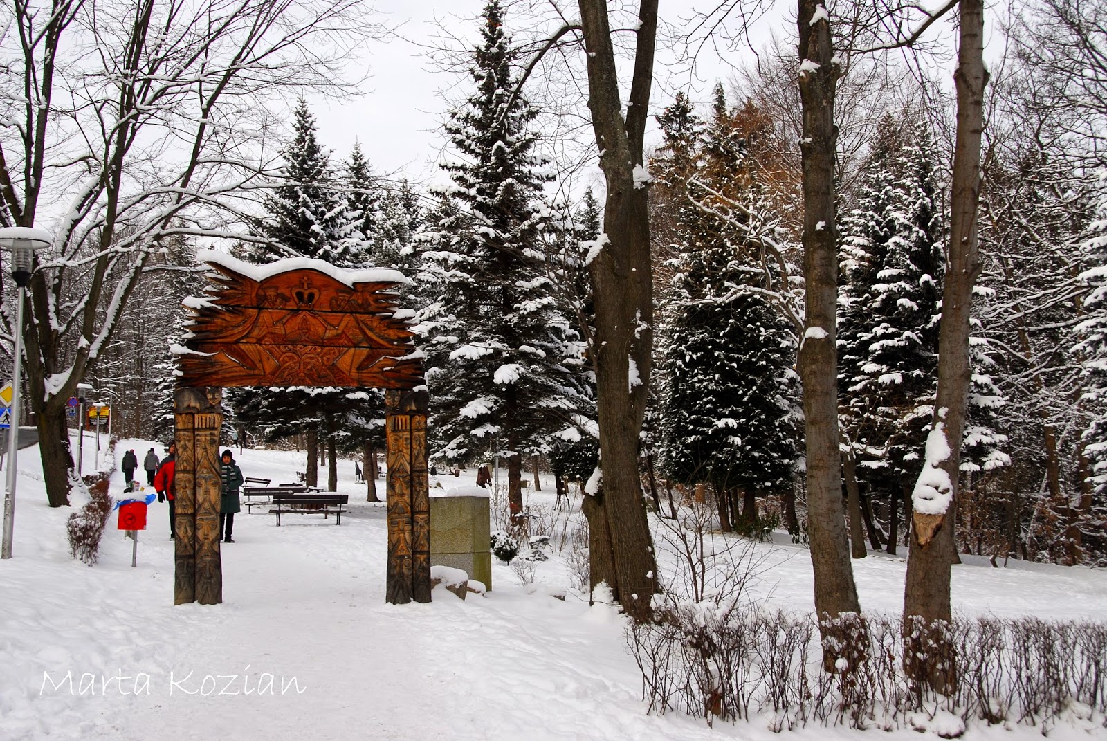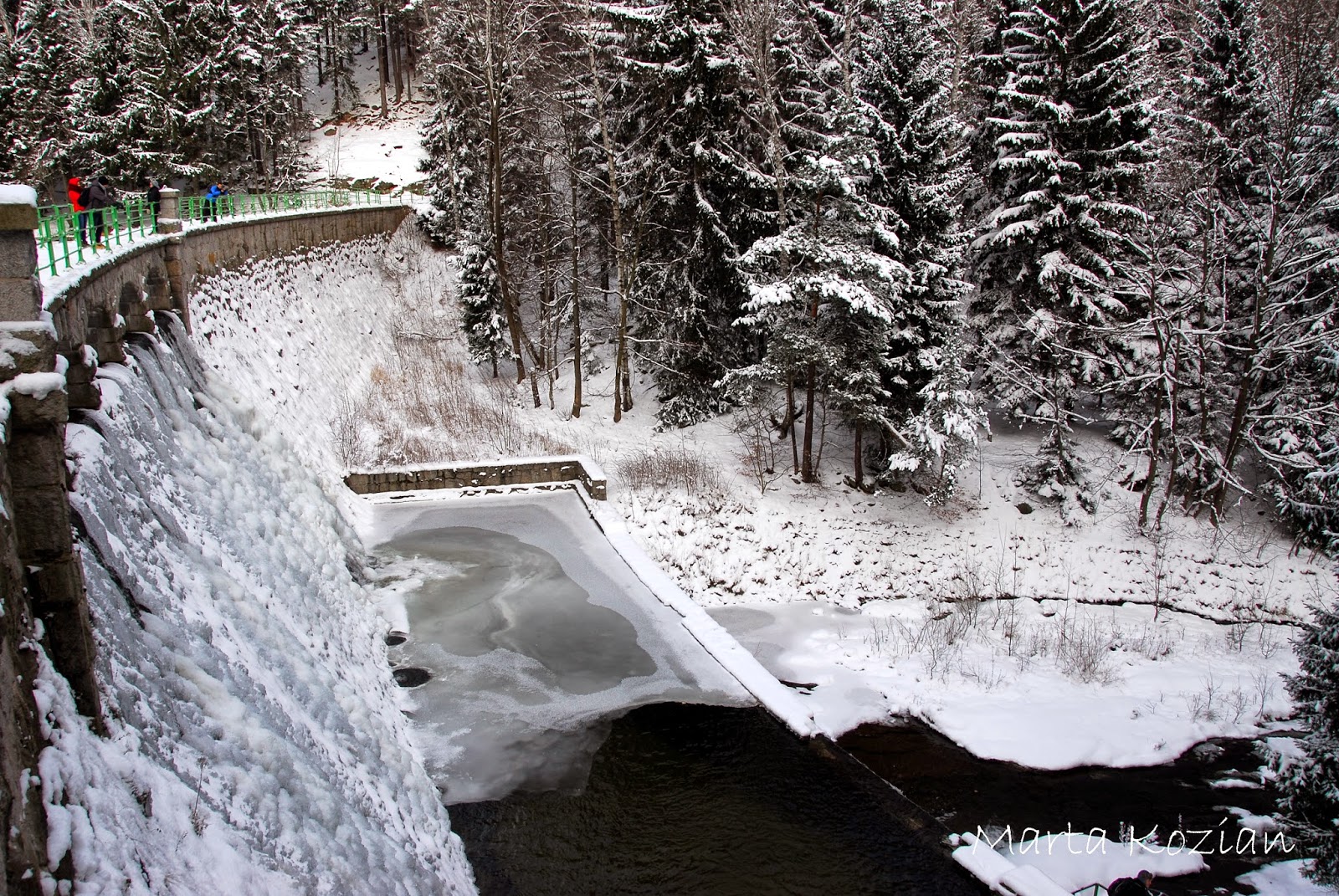 Naszym celem było zobaczenie Zapory na Łomnicy, dlatego przeszliśmy przez piękną, drewnianą bramę i wkroczyliśmy do niewielkiego parku, z którego jest zejście na Zaporę.