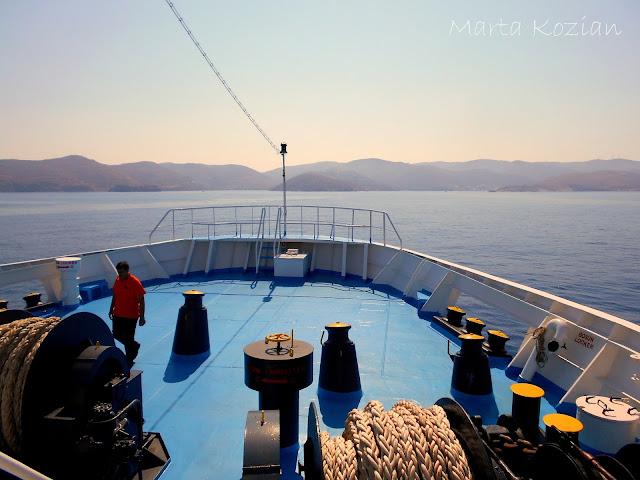 Przez pierwsze parę godzin podróży ładowaliśmy wszystkie telefony i aparaty... tak na zapas, bo przecież nie zawsze mamy dostęp do prądu ;) Oglądaliśmy również grecką telenowelę, którą tłumaczyliśmy na polski w naszej wolnej interpretacji, co było dość zabawne ;) Żałowaliśmy tylko, że poprzedniego dnia nie zrobiliśmy sobie zakupów na podróż i zmuszeni byliśmy do zakupu drogich, małych tostów w restauracji na promie... Do godziny 10 oglądaliśmy telewizję, a następnie, gdy już wszystkie baterie były załadowane, wyszliśmy na dziób. Widoki były ekstra! Zajęliśmy sobie krzesełka na samym przodzie, podziwialiśmy greckie Cyklady na Morzu Egejskim i opalaliśmy się przez ładnych parę godzin, delektując się tą niezwykłą chwilą ;)