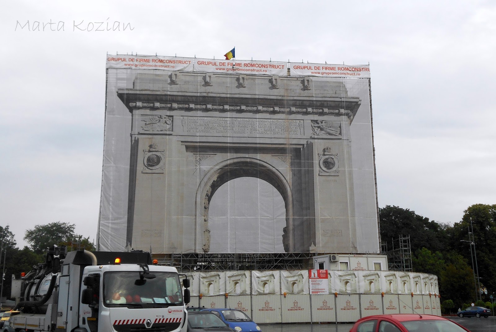 Po dość długim spacerze dotarliśmy do remontowanego Arcul de Triumf – łuk triumfalny usytuowany w północnej części Bukaresztu, na alei Kiseleff. Pierwszy, drewniany łuk stanął w tym samym miejscu zaraz po uzyskaniu niepodległości przez Rumunię (1878 r.) – walczące o wolność kraju oddziały mogły więc pod nim przejść. Kolejny obiekt wybudowano w 1922 r., po I wojnie światowej. Zburzono go w 1935 r., aby wybudować kolejny pomnik, który znajduje się obecnie w tym samym miejscu. Budowa zakończyła się we wrześniu 1936. Arcul de Triumf poświęcony jest wszystkim żołnierzom walczącym w barwach Rumunii. Podobieństwo do paryskiego Łuku Triumfalnego symbolizuje również przyjaźń rumuńsko-francuską. Trochę było nam szkoda, że trafiliśmy akurat na remont... no cóż, czasami tak bywa ;)