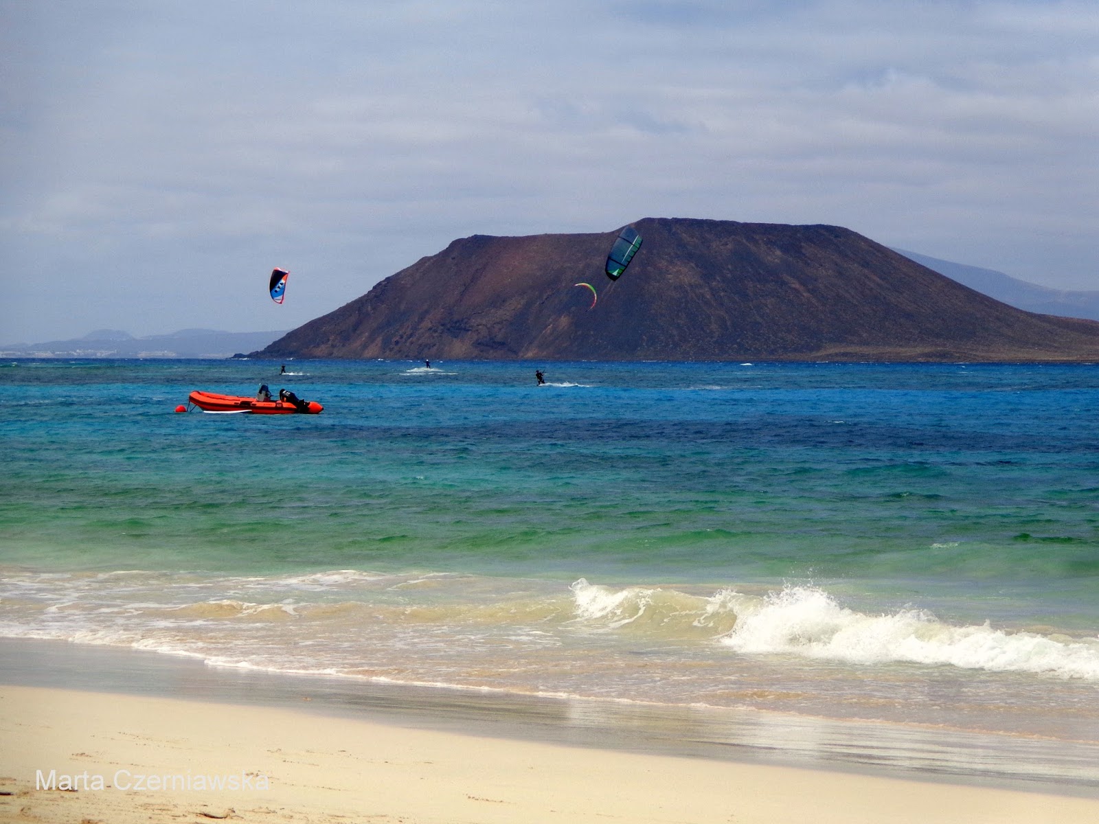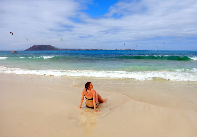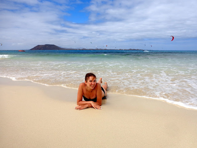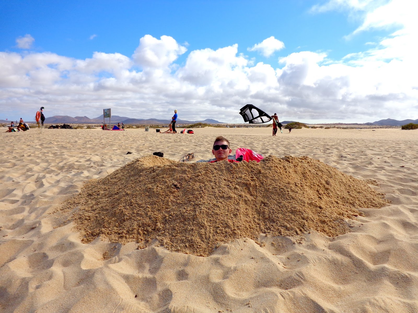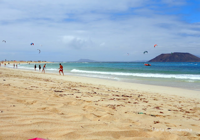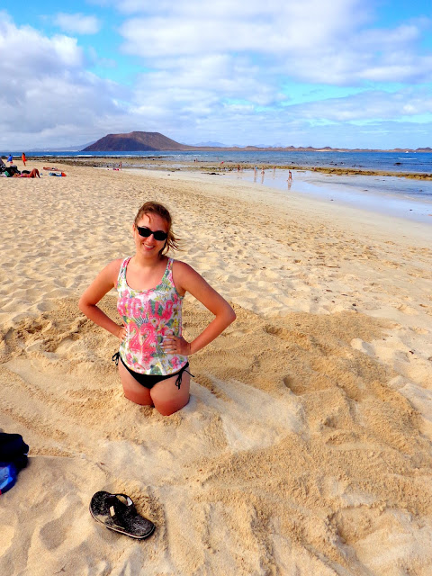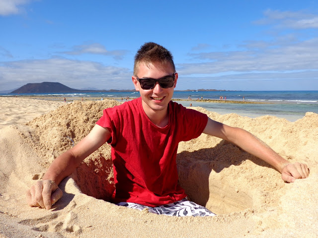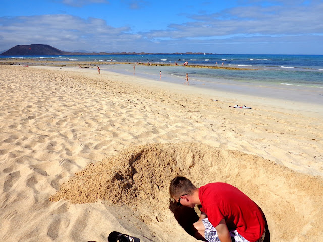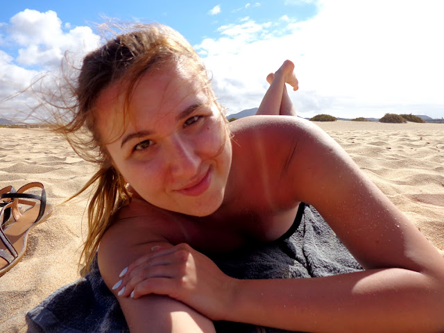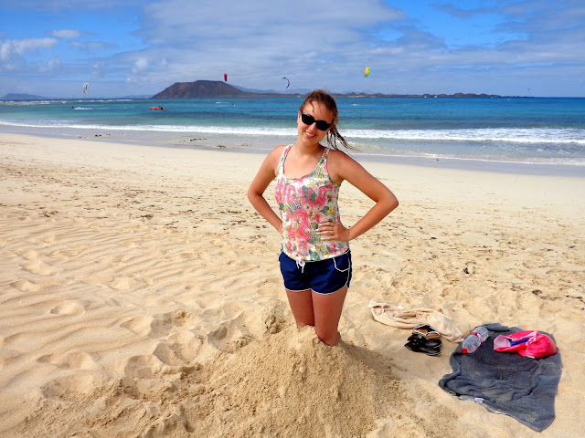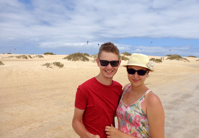 Po jakimś czasie zaczęliśmy powoli zbierać się z plaży i ruszyliśmy pieszo w stronę Corralejo. I właśnie wtedy wyszło słońce! Stwierdziliśmy, że i tak nigdzie nam się nie śpieszy, a następnie rozłożyliśmy z powrotem ręczniki :) Ja leżałam, chcąc się jeszcze choć trochę opalić, a Michał w tym czasie kopał w piachu. Dobrze, że nie miał zamiaru zakopania tam swojej świeżo upieczonej żony :)