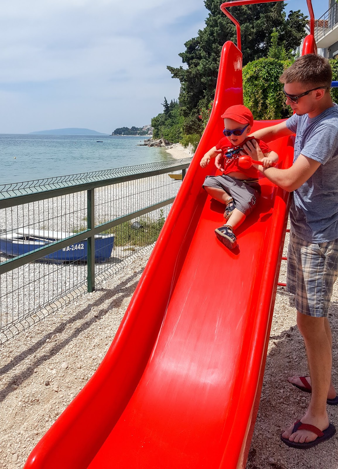 Po krótkim porannym plażowaniu wybraliśmy się do sklepu. Droga nie jest łatwa, bo niestety stromo pod górkę, co z wózkiem było dość ciężkie. Wracając zaszliśmy na plac zabaw póki jeszcze zjeżdżalnia nie nagrzała się zbyt mocno 😉